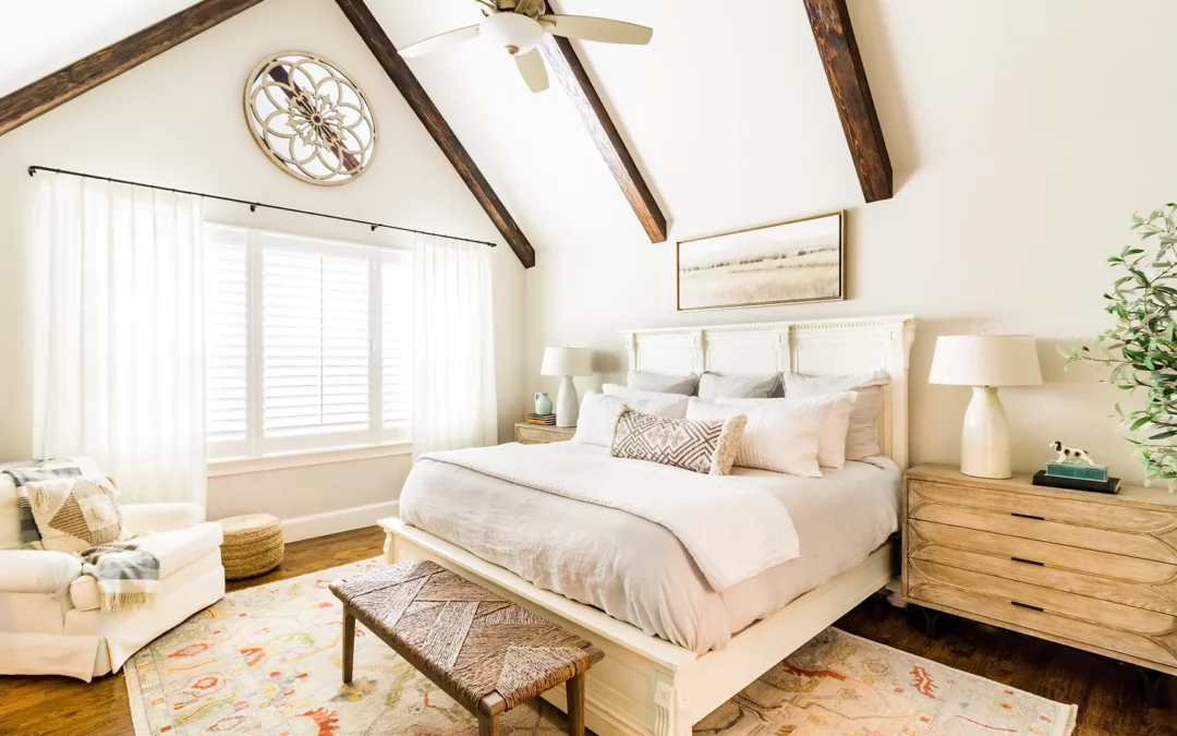 How to create this look? Opt for a warmer white wall color as a base to work from and decorate your space with carefully curated pieces. Less is more with ceramic vases, monochromatic textures, woven baskets, and pendant lights.